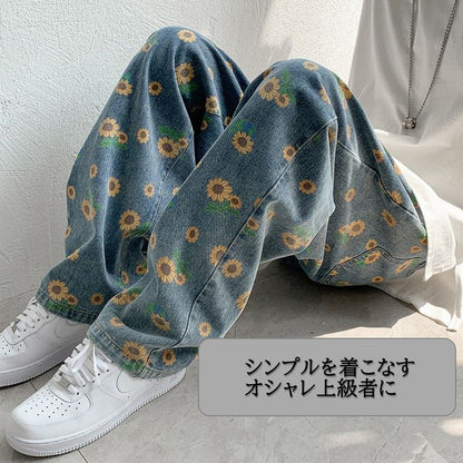 -ヒマワリ柄のデニムパンツクセの強いコーデを!